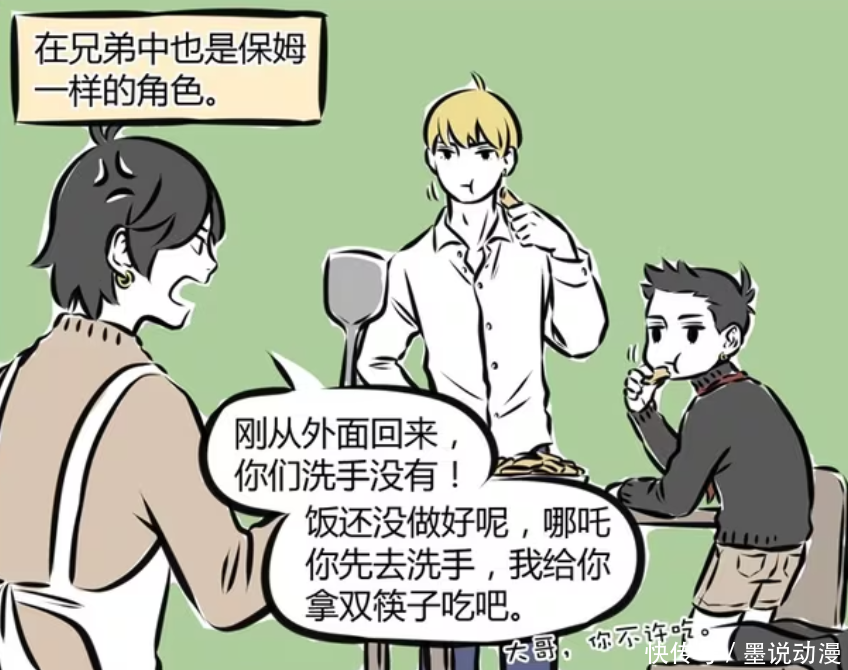 在兄弟之中,木吒一样是保姆。李靖没那么多时间管他们,他们的母亲也从未出现过。木吒还要负责做饭,还要让兄弟们吃饭前吸收。饭还没有做好,木吒让哪吒去洗手,还给他准备筷子。至于木吒,那就是不能再偷吃,等饭好了再一起吃。